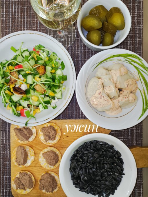 горячая закуска (лук, икра трески, майоненый соус, масло), овощной