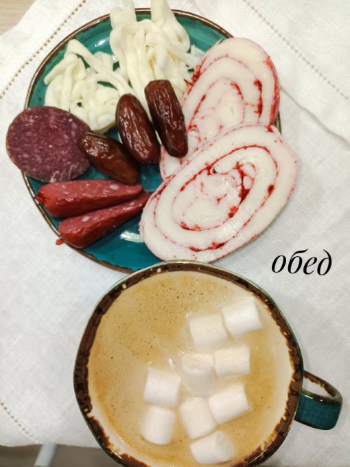 копчёный сулугуни, мандарин, манго в сахаре, кофе с молоком.