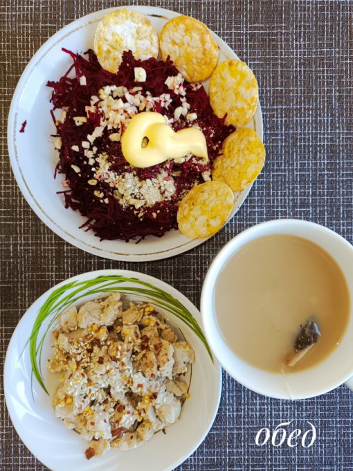 хлебцы, салат (сырая свекла, чеснок, кедровый жмых, сырный соус),