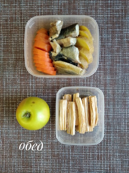 картофель, отварная морковь, соевая спаржа, яблоко.