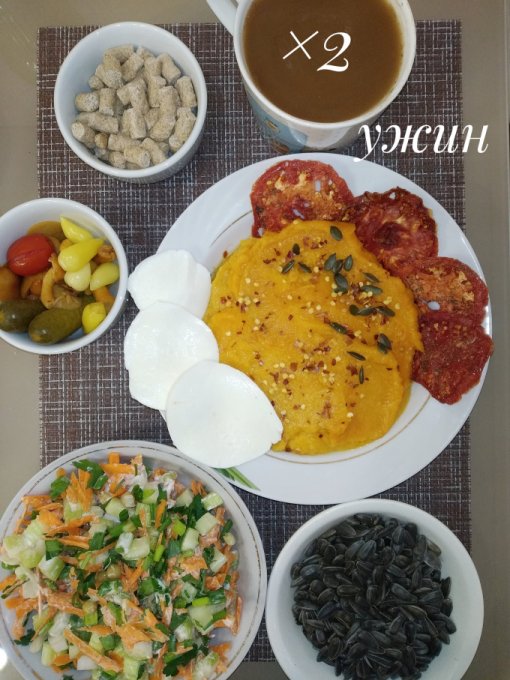 соленья, овсяные отруби, семечки, кофе с молоком.