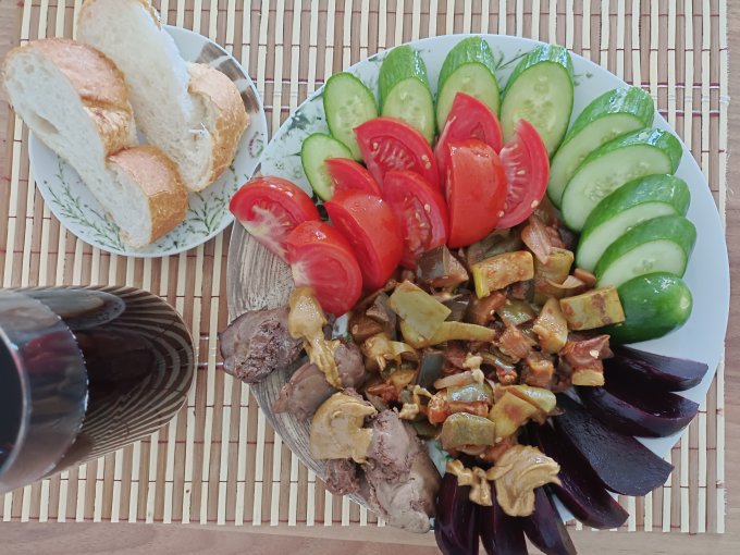 запечённая свекла, соус тахинный, хлеб, огурцы, помидоры, Cola