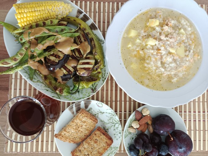гриле; тахинный соус; орехи; слива; виноград 🍇