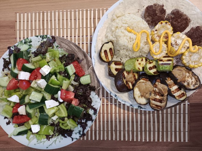 Ужин: кёфте; лаваш; булгур; овощи на