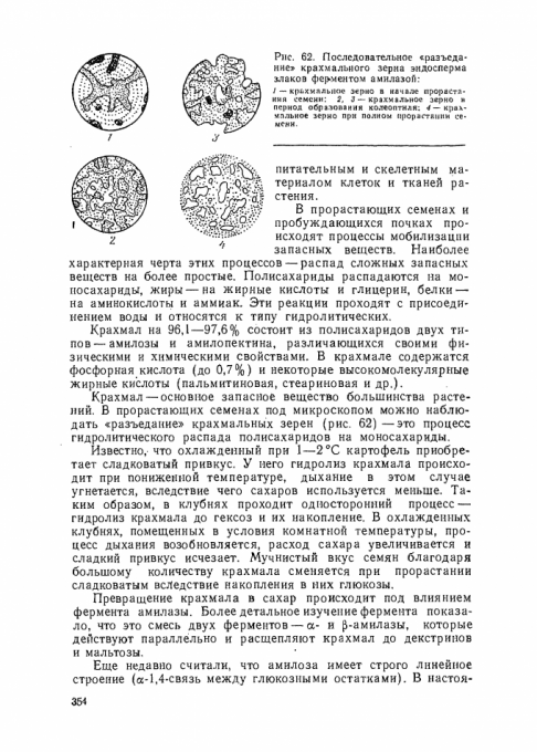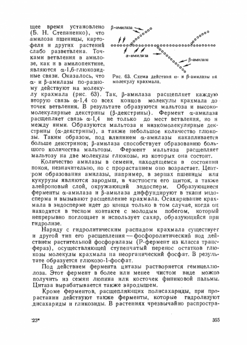 Количество амилазы в семени, находящемся в состояния покоя, незначительно, но с прорастанием оно возрастает. Центром образования амилазы, например, в зернах пшеницы или кукурузы являются зародыш, в частности его щиток, а также алейроновый слой, окружагонлий. эндосперм. Образующиеся ферменты а-амилаза и -амилаза диффундируют в ткани эндосперма и вызывают расщепление крахмала. Осахариваиие крахмала в эндосперме идет до конца только в том случае, когда он находится в тесном контакте с молодым побегом, который непрерывно поглощает и использует сахар, образуюпщйся при гидролизе. (ссылка)