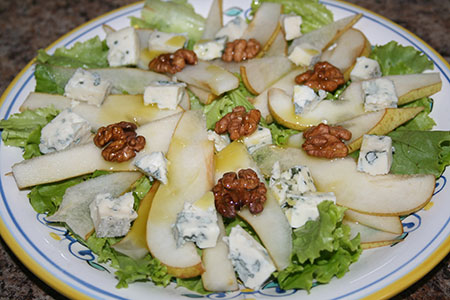 голубой плесенью(много его не нужно),орехи (грецкий или арахис) ,