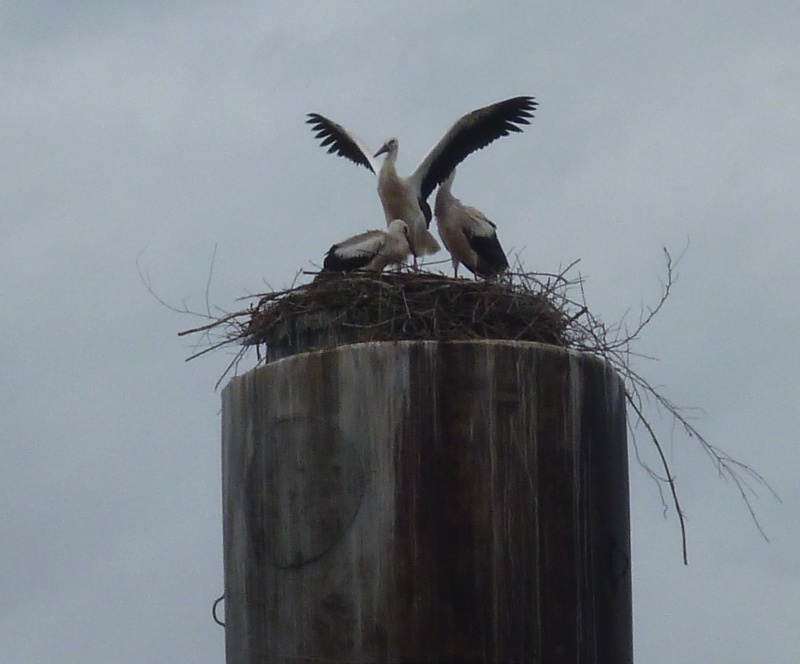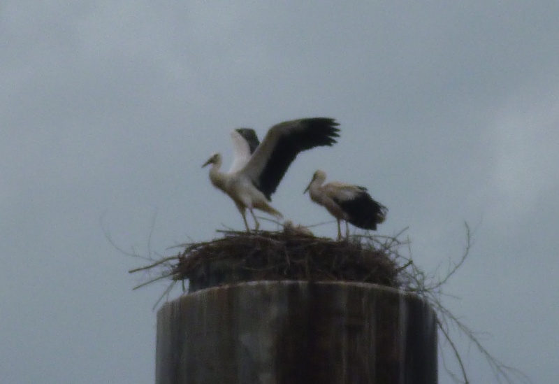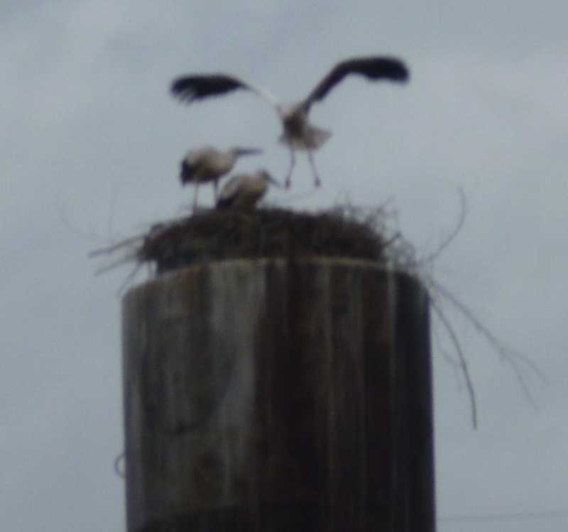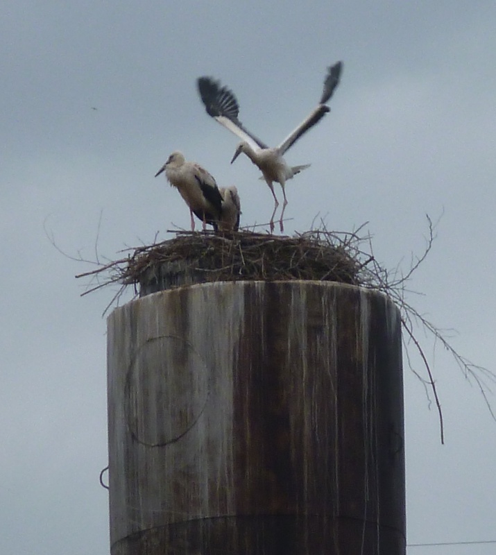 Стараются уже взлетать, но не получается, а мама с папой прилетают, еду приносят и показывают как нужно взлетать. Интересно за ними наблюдать, но никак не получается сфотографировать, как прилетают и улетают взрослые аисты.