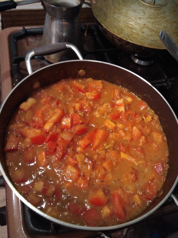9. Добавить помидоры, томатную пасту, карри, готовить ещё 5