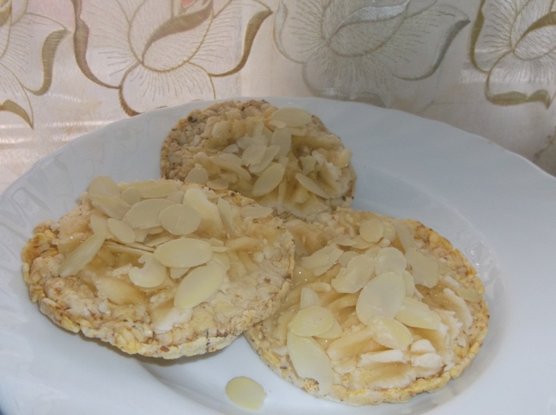 Кукурузные хлебцы намазываю бананом и присыпаю миндальными