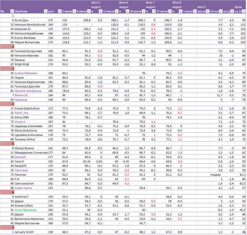 | № | Имя/ник | рост | 1 июня | 6 июля | Итог 5 недели | 13 июля | Итог 6 недели | 20 июля | Итог 7 недели | 27 июля | Итог 8 недели | 3 августа | итог 2 месяца | Осталось до цели | результат | Цель на 1/09 |