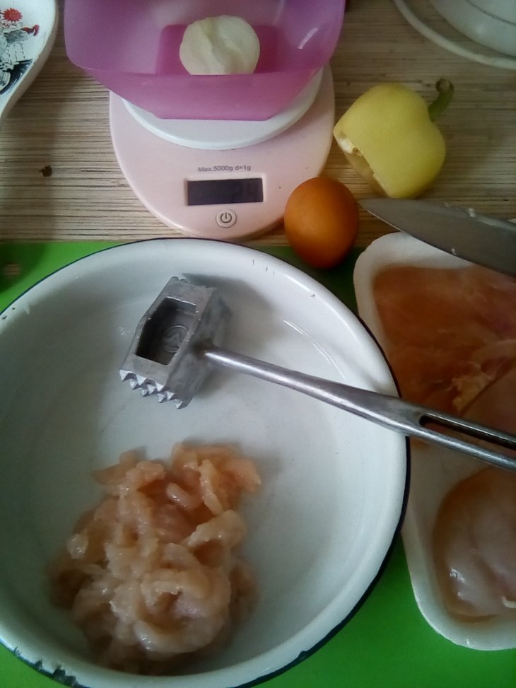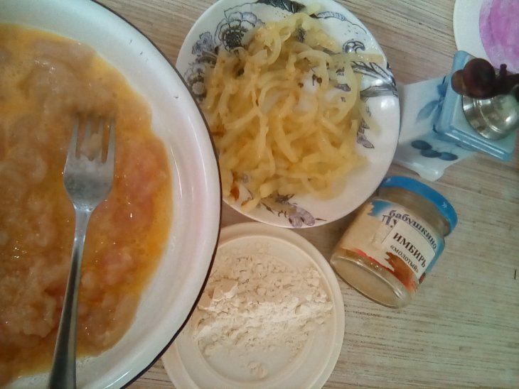 В полученную массу добавить куриное яйцо и муку, посолить, поперчить, добавить щепотку молотого имбиря, хорошо вымешать