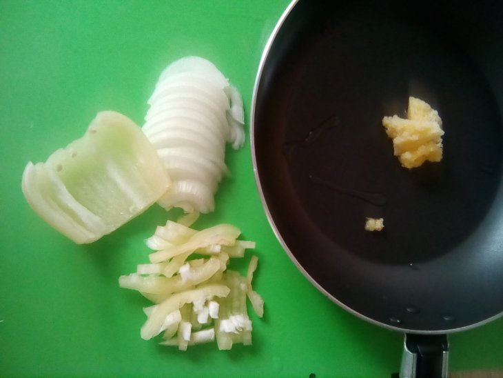 Лук и сладкий перец нашинковать полукольцами и соломкой