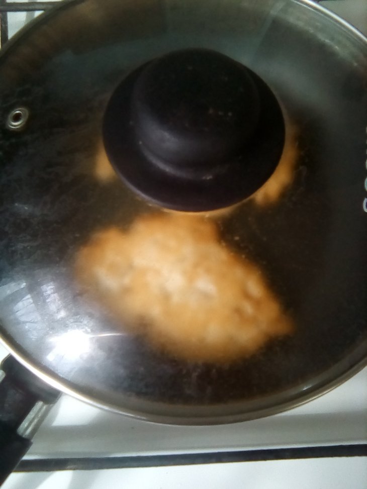 Жарить: сначала на открытой сковороде, выкладывая массу столовой ложкой, смоченной холодной водой, до румяности. Перевернуть и под крышкой дожарить вторую сторону.