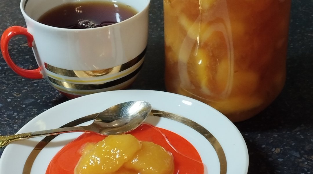 Варенье получается прозрачным с кусочками персика, после остывания