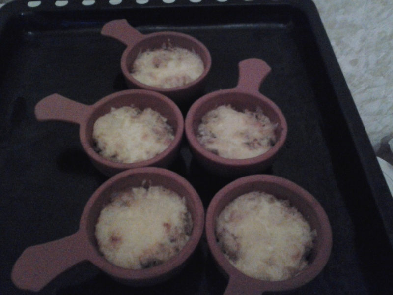 кокотницы; затем посыпать тертым сыром и отправить в духовку