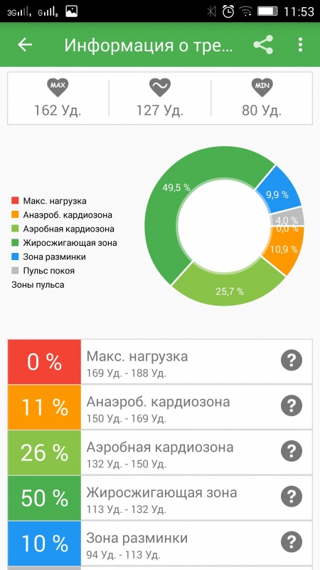 Моя зона жиросжигания 113уд.-132уд., показание пульса на
