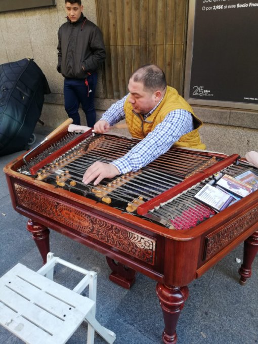 Тут настройщик посреди улицы сосредоточенно настраивает неизведанный музыкальный инструмент