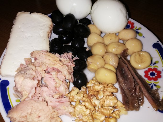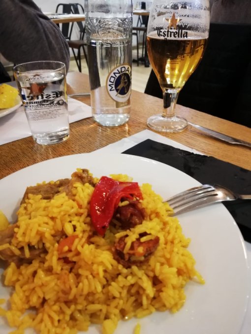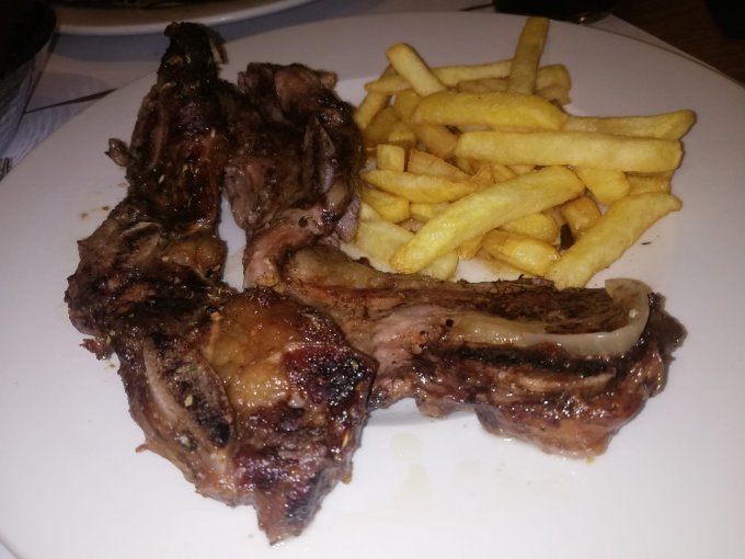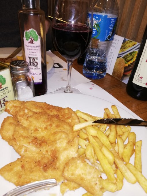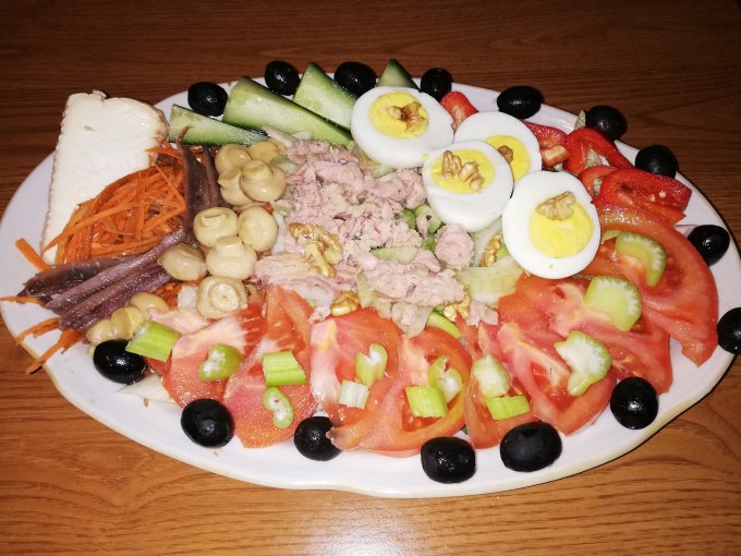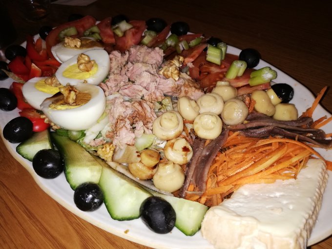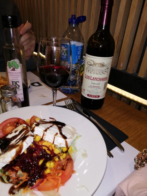 Первый день промчался незаметно.  Мы нашли уютный ресторанчик в центре, где потом и кушали в обед и вечером все дни пребывания в этом райском уголке.. Паэлья на первое, вкусный салат из овощей, кукурузы и пары приличных кусков козьего сыра, политого бальзамическим уксусом и оливковым ароматным маслом на второе, бутылка вина и кусок торта. Это комплексное меню на человека, цена 10-12 евро.( почему-то каждый день цены менялись). Мой мч питался поплотнее: паста, мясо с жареной картошкой, и никакого алкоголя.. и свою порцию торта отдавал мне-я сладкоешка...