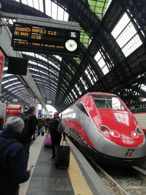В Милане мне пришлось минут 30 подождать скорый поезд на Неаполь.. расстояние километров 700..время в пути часа 4. Поезд называется « Красная стрела». На это поезд билеты были самыми дорогими. Что-то около 90евро..( остальные билеты стоили от 6 до 12 евро).