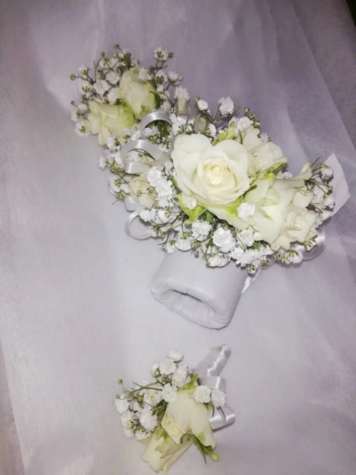 И вот пришли представители агентства. Принесли цветы. Броши в виде живых цветов для жениха и свидетеля, и браслет на руку для меня, тоже из живых цветов..