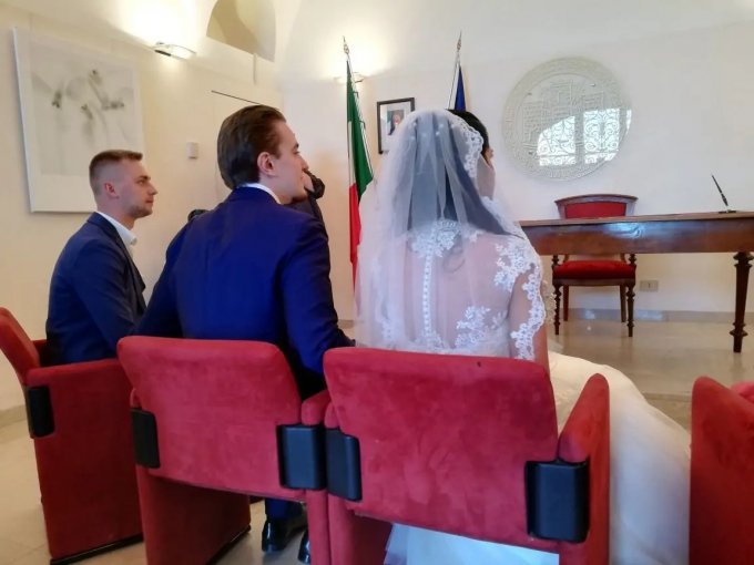 Подошла свидетельница, и по совместительству сестра невесты, и их всех тоже усадилина кресла лицом к мэру, который им зачитывал права и обязанности, и просто что-то шутил