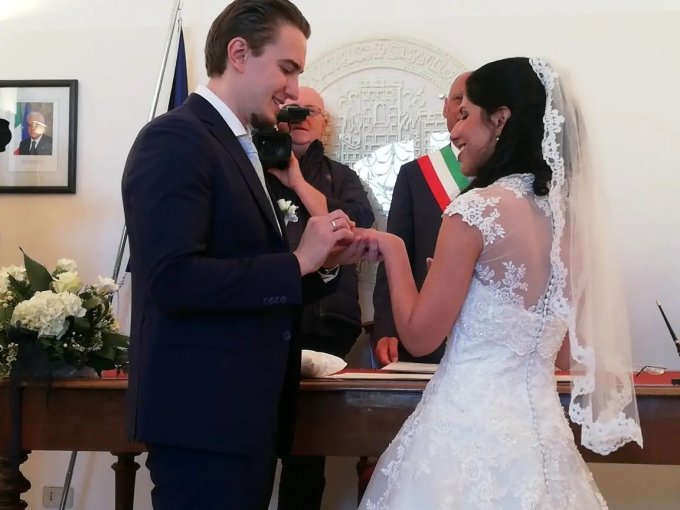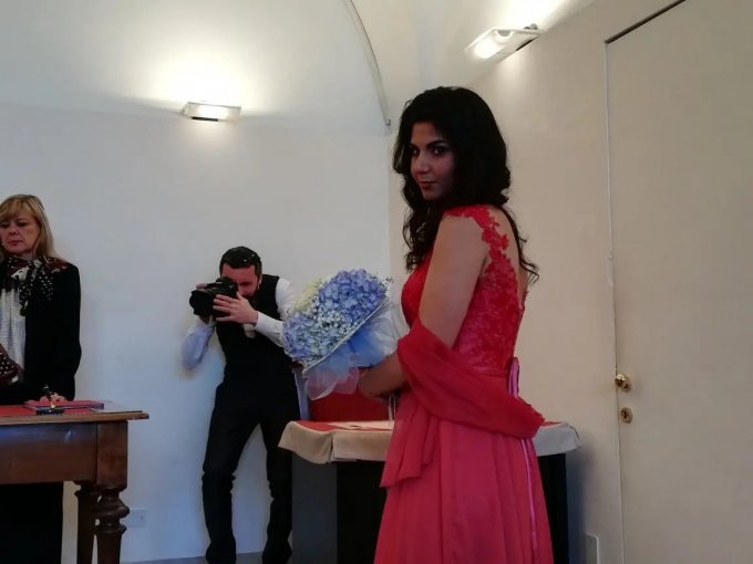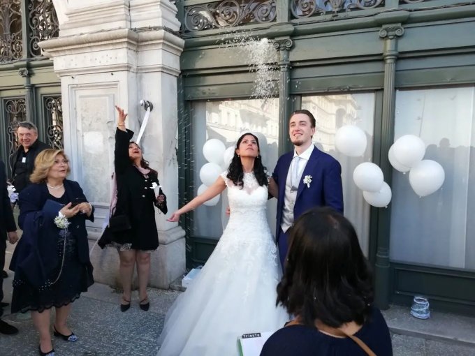 Фотограф нас фотографировал со всех сторон, подстраивая сцены и просто подлавливая нужные моменты. Слава Богу, денёк выдался замечательный, было не жарко, около +20, поэтому мы не надели верхней одежды. Скажу вам, мне понравилось ходить с моим ростом по многолюдному туристическому центру большого города на высоких каблуках и в платье в пол ( итальянки заканчивались у меня где-то в районе подмышек).., комплиментов от незнакомых людей наслушалась так много, что хватит на год.. а тут ещё подошёл свадебный видеооператор с огромной камерой, и в центре большой площади, куда выходят сотни барных столиков , забитых по случаю субботы людьми,  стал нас снимать тоже, то прося повальсировать, то пройтись, делая вид, что не замечаем ни съемку, ни фотоаппарат. Вокруг нас стали собираться люди , и тоже начали нас снимать, не понимая, что происходит. Меня все это так забавляло, что позволило вести себя очень свободно и раскрепощенно, что, в принципе, мне не свойственно. В этот момент я не могла снимать, значит, буду ждать фотографии профессиональных фотографов. А тут и народ на площадь стал подтягиваться, из приглашённых на свадьбу