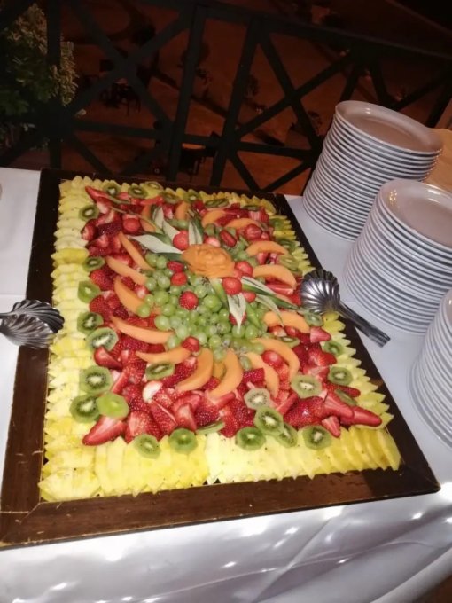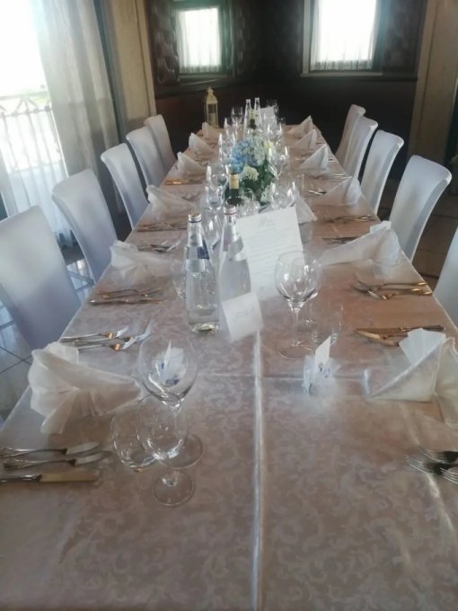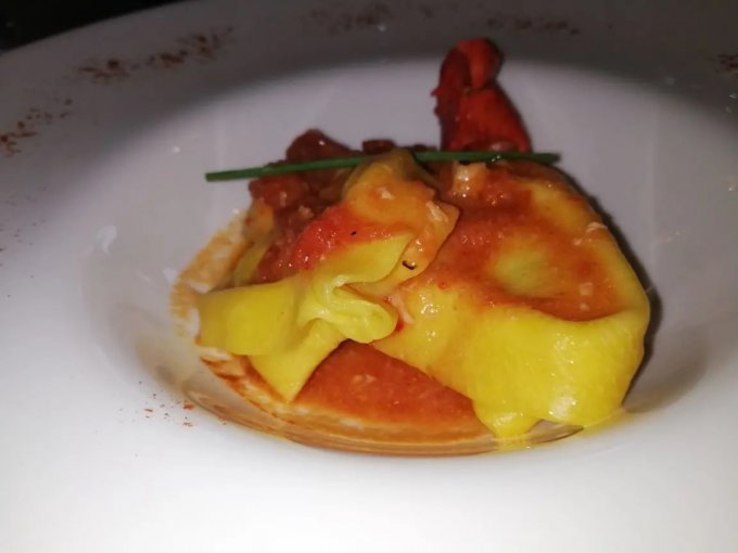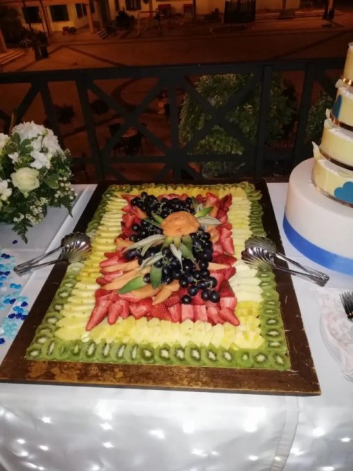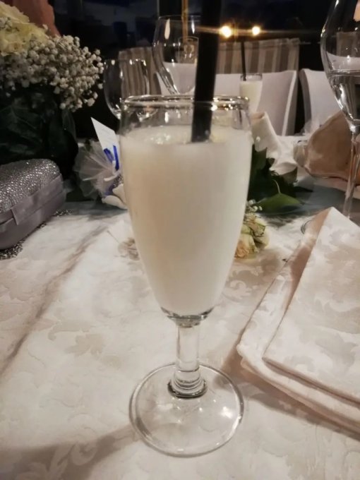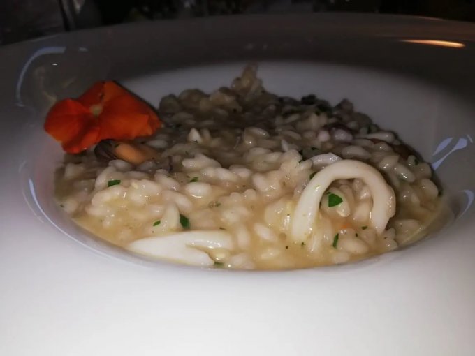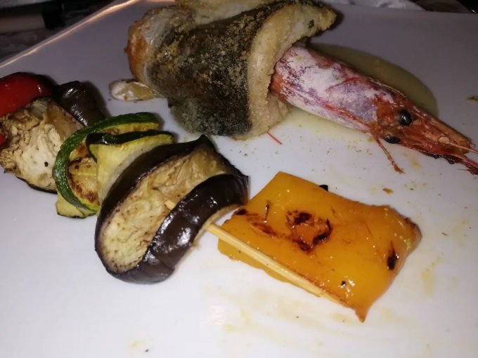 В ресторане все было, как в ресторане на свадьбу.. музыка, танцы и еда..Было 2 меню, рыбное и мясное, и у гостей за пару недель спрашивали об их выборе. Еду в тарелках носили каждому индивидуально, а не ставили общие тарелки на стол, как это принято в России. У меня было рыбное меню, как и у большинства гостей. На первое ризотто с морепродуктами, затем равиоли с мясом крабов. Затеи перерыв и щербет. Затем рулет -омар в рыбе, не знаю, как перевести ее название на русский, и шпажка с овощами на гриле. И много вкусного вина.