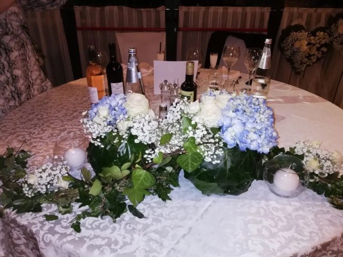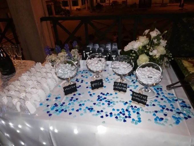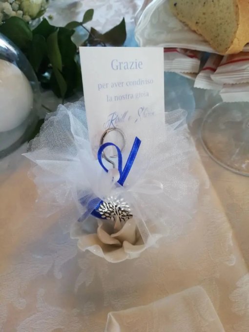 И вторая деталь.. на итальянских свадьбах дети готовят и дарят небольшие подарки гостям. У каждого прибора на столе стоял фарфоровый цветок-подставка под фотографию, с символом дерева жизни, приносящего удачу.. с привязанным мешочком свадебных конфет.  Мило и симпатично..