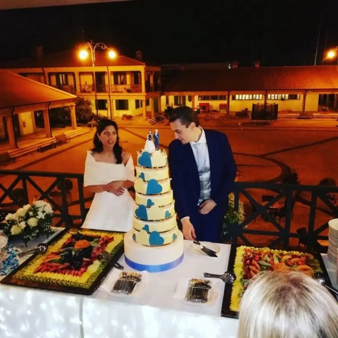 На этом своё описание я хотела закончить, но добавлю две детали.  Первая. На торте, на самом верху, стояли фигурки жениха и невесты. И они не были стандартными. Заранее устроители узнали детали и воплотили их в жизнь. Жених на торте был одет точно так, как на свадьбе(цвета костюма), а у невесты в руках была чёрная собачка, точно такая, как та, что с ними живет.