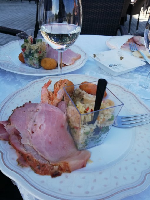 После всего этого молодожены уехали на ретроавтомобиле на фотосъемку, а гости переместились в ресторан, по дворе стояли столики, а на веранде в красивых чашах и тарелках было много разных закусок и вина. Это был очередной аперитив, призванный разбудить аппетит. Все , включая меня, были очень голодны, поэтому мы больше заботились о наполнении тарелок, чем о фотографиях столов с аперитивом. А жаль. Столы были очень красивые и аппетитные