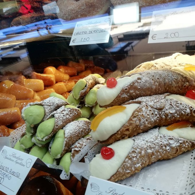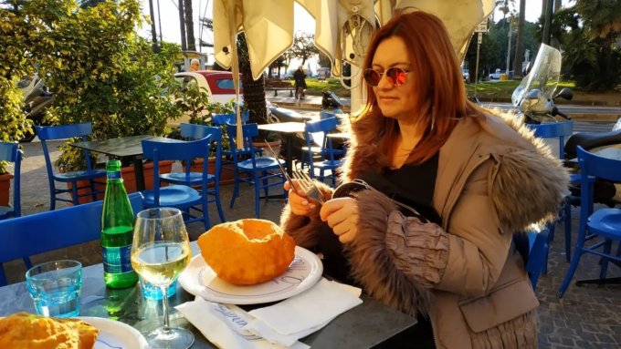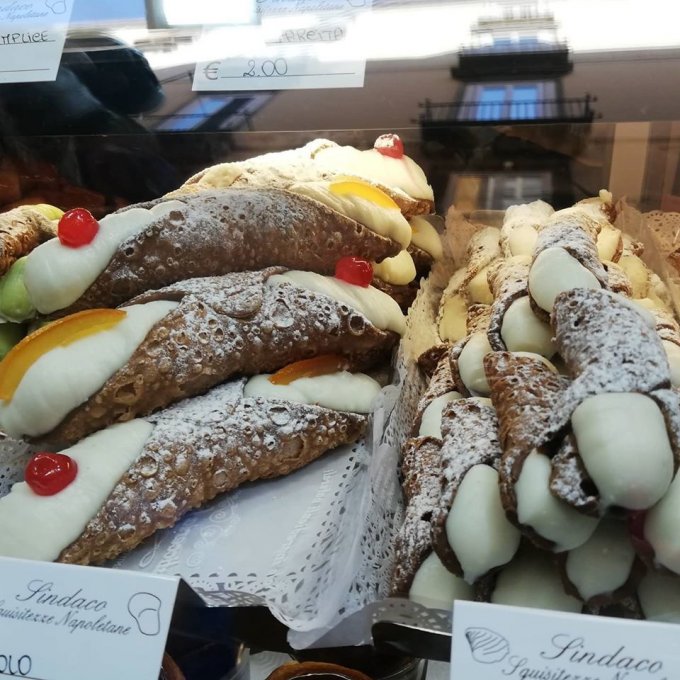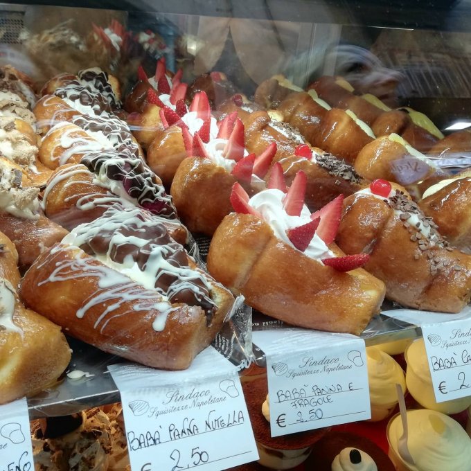 Риччи это такие вкусные из слоеного теста пирожные, полные сливочного крема как внутри, так и снаружи. А сверху украшенные мелкими ягодками, похожими на клубнику. Ещё они были с рикоттой, но мне нравились именно с кремом. Вообще в Неаполе все пропахло едой, в частности, сладостями. Каждые 30-50 метров на центральных улицах можно найти киоски, бары, просто витрины со всевозможными сладостями и не только