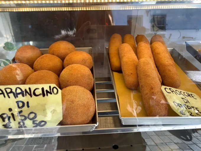 И аранчини с картофельными крокетами.. аранчини это шары из риса, в центре которых мясное рагу с зелёным горошком, все скреплено корочкой из теста...их готовят и тут же продают горячими..