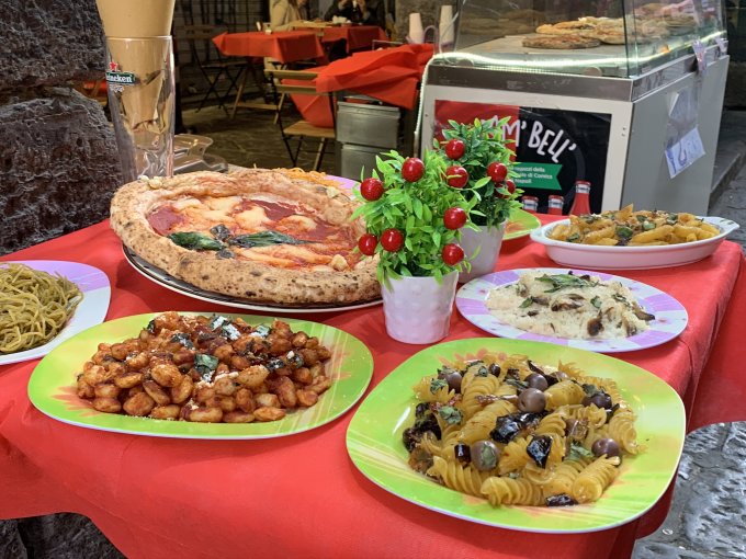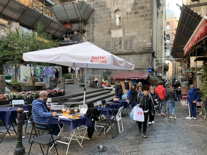 Так выглядят уличные заведения стрит фуд .. Пицца фритта , жареные во фритюре морепродукты , пироги, сладости- все это покупается и поедается в огромных количествах. Кажется, люди здесь или все время едят, или только что поели, или стоят в очереди за едой..