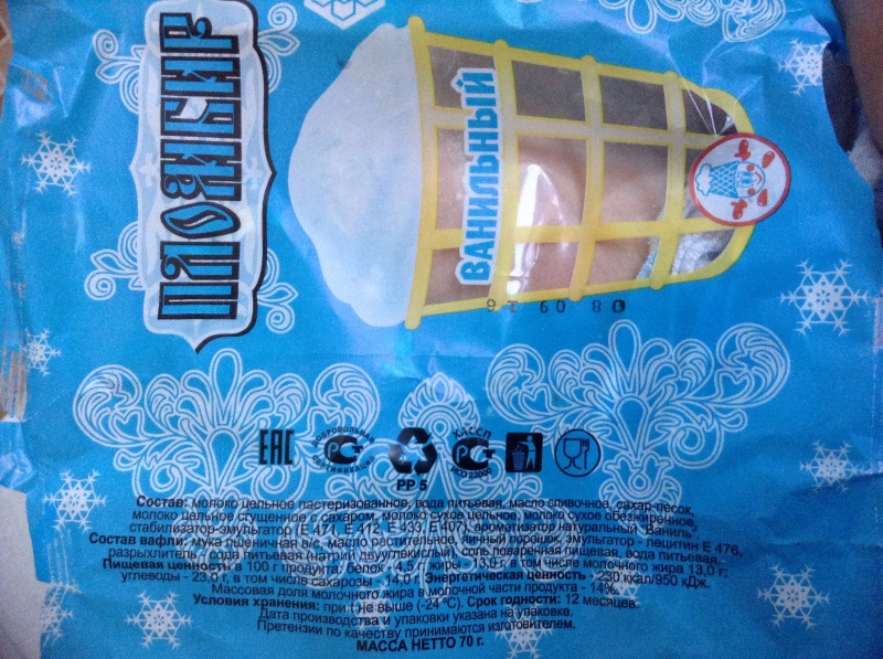 В списке продуктов такого мороженого не нашла ! Вот вбила ) ........... Калорийность -230 . Б.-4,5 , Ж.-13 , У.-23 Масса-70гр.