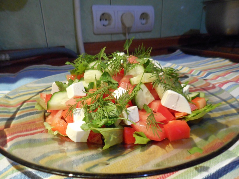 мой Грек -салат 20 грамм. красный сладкий перец 75 гр.помидор 75 гр.огурец 75 гр.фета 30 гр.укроп и ...