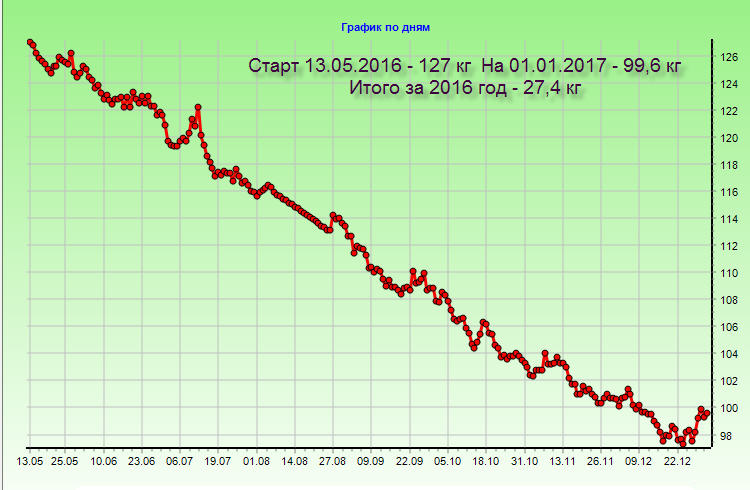 Итог процесса за 2016 год. За новогодние праздники вернула 1 кг, до НГ видела уже несколько дней 97,3-97,5.