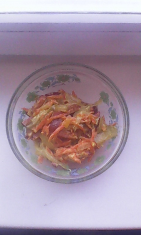 Салат `обжорка` Состав: морковь-100 гр.лук репчатый-100 гр.огурец чоленый-100 гр.колбаса куриная сыр...
