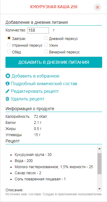 А у меня варка кукурузной крупы выдаёт при 394 граммах 1275.4 калорий, что-то здесь явно не так у меня
