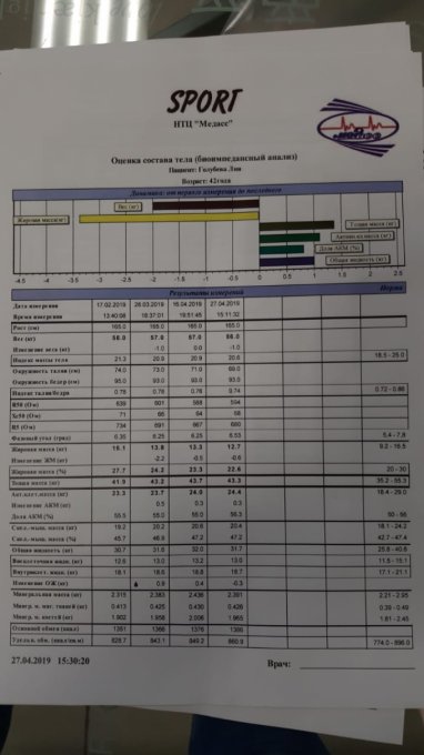Итог с 17.02 по 27.04 - минус 4 кг жира, плюс 1,4 кг жира.