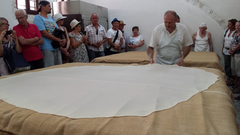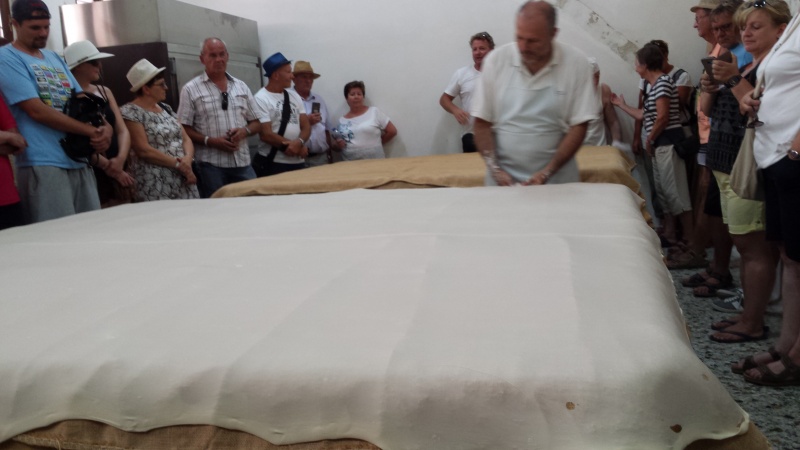 теста растягивается на огромныи стол, превращясь в тончаишую