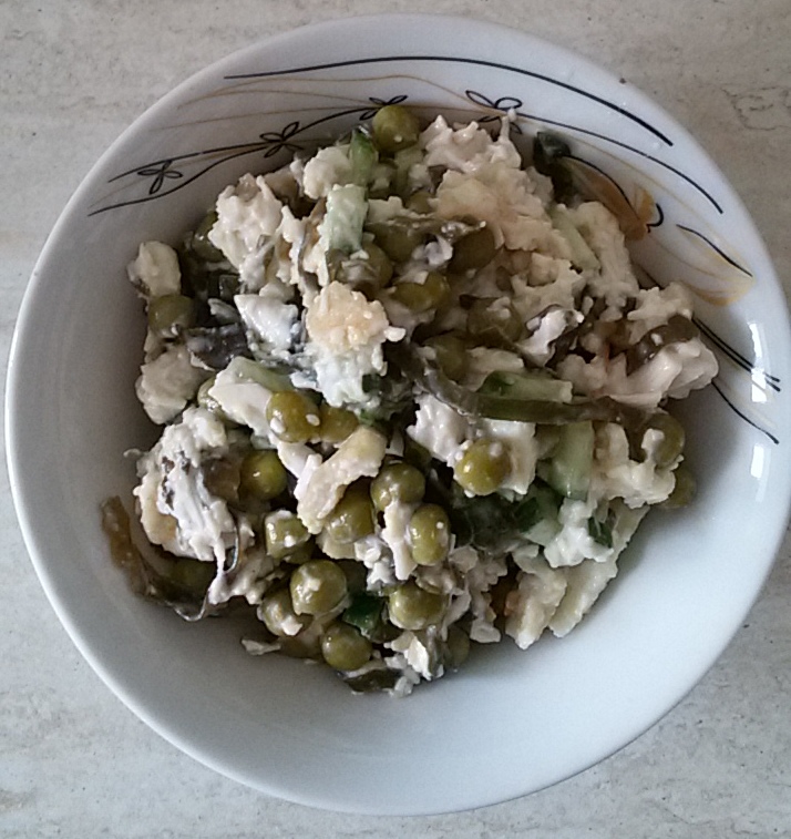 5. Все смешать в салатнике, добавить консервированный горошек и