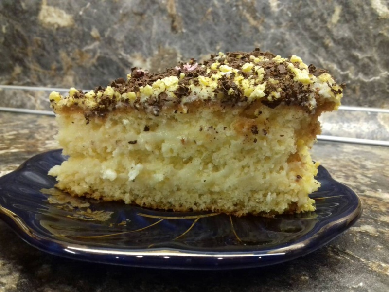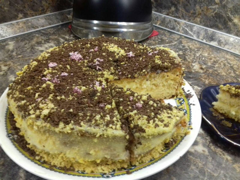 Испекла ей вот такой тортик - нежнейший бисквит с заварным кремом, вкуснотища неимоверная вышла!