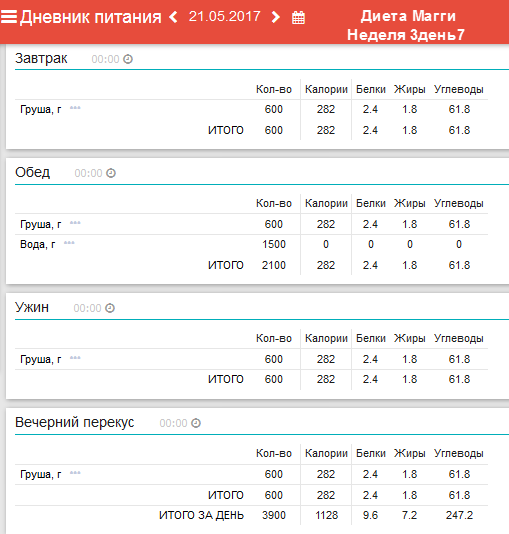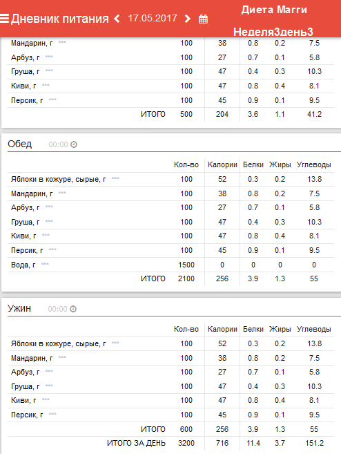 фрукты; ужин – отварное мясо.