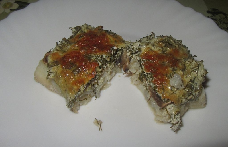 кто-то не любит грибы, можно вместо них выложить на рыбку кружочки
