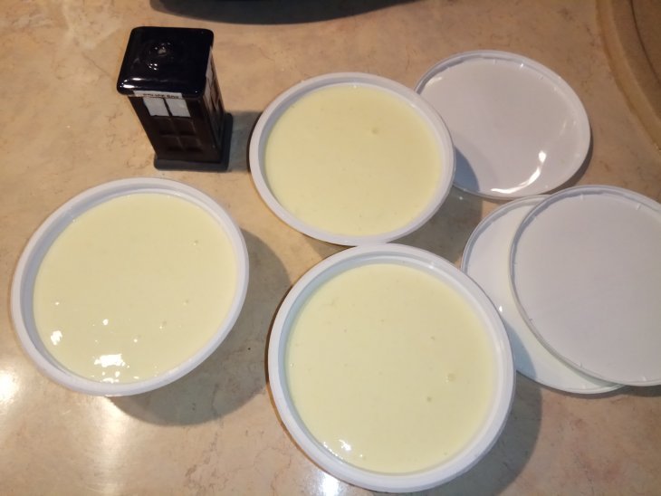 Разливаем в формочки. Для домашних заливаю в красивые формочки, добавляю больше сиропа и сахар. Для себя заливаю в баночки, как на картинке (в них около 200 грамм получается, очень удобно).