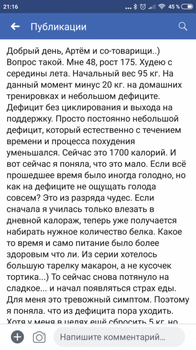 . Я уже говорила про себя, что я буквально в феврале-марте прошлого года ела 1600 ккал для поддержания текущего веса, был упадок сил, депрессия, у меня все время было желание прилечь, присесть, делать ничего не хотелось, так и волосы стали выпадать, но и вес не падал.