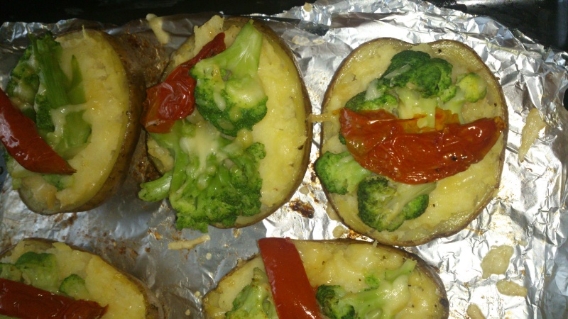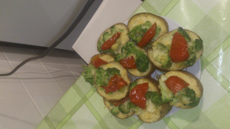 смешать в печеным картофелем и вложить обратно в "коробочки" из