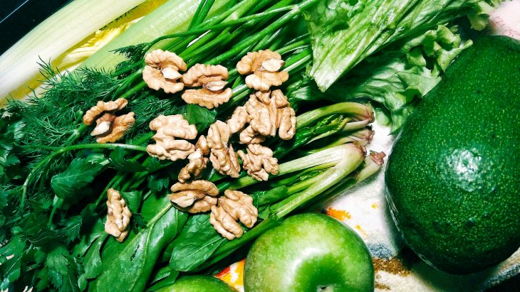 укроп, шпинат, петрушка, горсть грецких орехов, 2 ст. л. семян