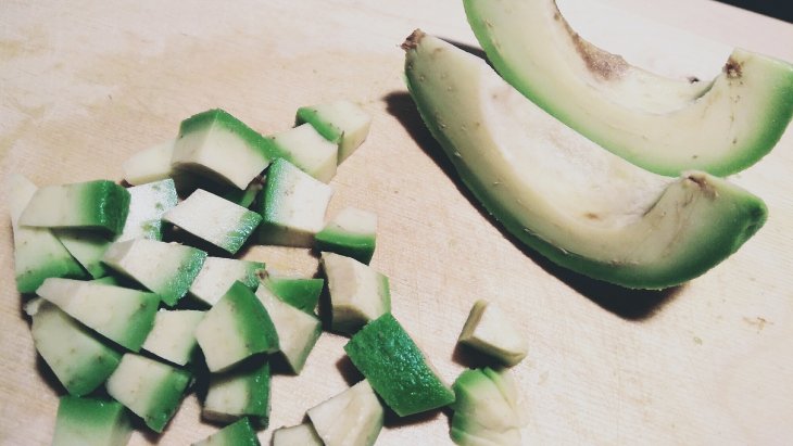 Аккуратно нарезать авокадо, предварительно разрезав пополам, удалив