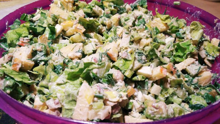 Добавить орехи, несладкий йогурт и нарезанную зелень. Все смешать.